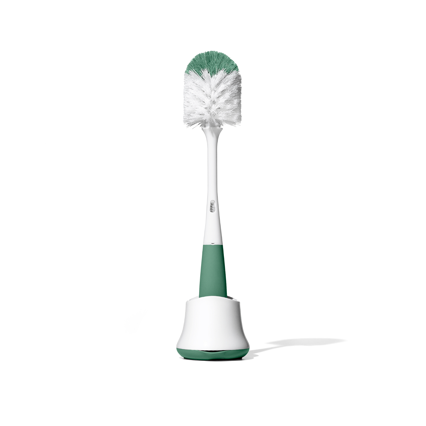 Brush head has two types of bristles for gentle cleaning and serious scrubbing Flexible neck for easy reach inside bottles