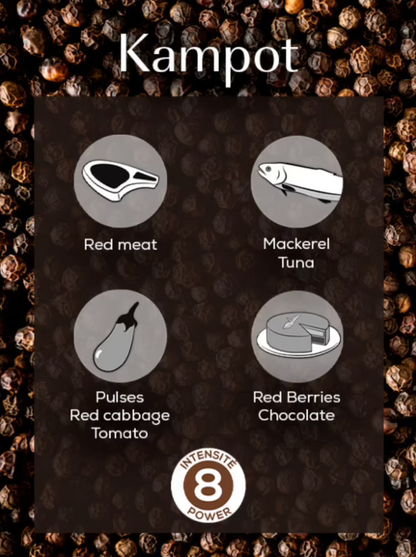 A black pepper with sweet fruity notes and a hint of suave menthol, this spice is a perfect match for red meat, oily fish (tuna and mackerel), vegetables (red cabbage and tomatoes) and legumes (lentils and chickpeas) but also red berries (strawberries, cherries, etc.) and chocolate.