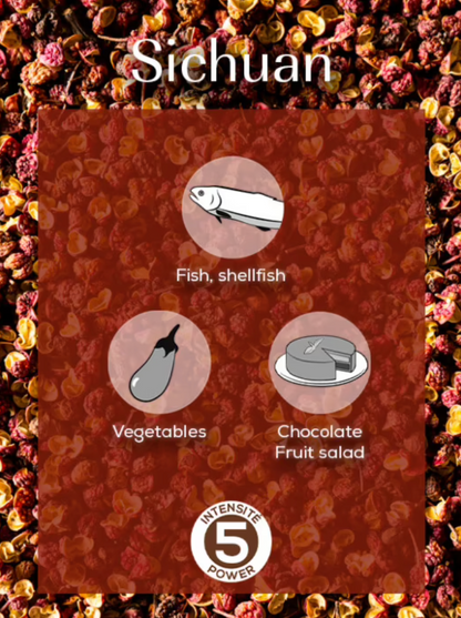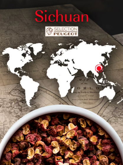 These peppercorns come from China and have been renowned for their exquisite flavour since ancient times. Sichuan red peppercorns are highly aromatic with flowery citrus notes (orange peel and bergamot) that are an ideal match for savory dishes, including duck, fish, pork and chicken. Sichuan pepper is also the ideal accompaniment for sweet treats and desserts containing chocolate or fruit (citrus, apricots and melon). We would advise you to grind the pepper at the very last minute using a Peugeot pepper mill on a fine setting to avoid cooking the pepper, which tends to develop a bitter taste. Sichuan red peppercorns can also be infused into your favorite oils or even honey which creates a sensational marinade for meats and roasted vegetables.
