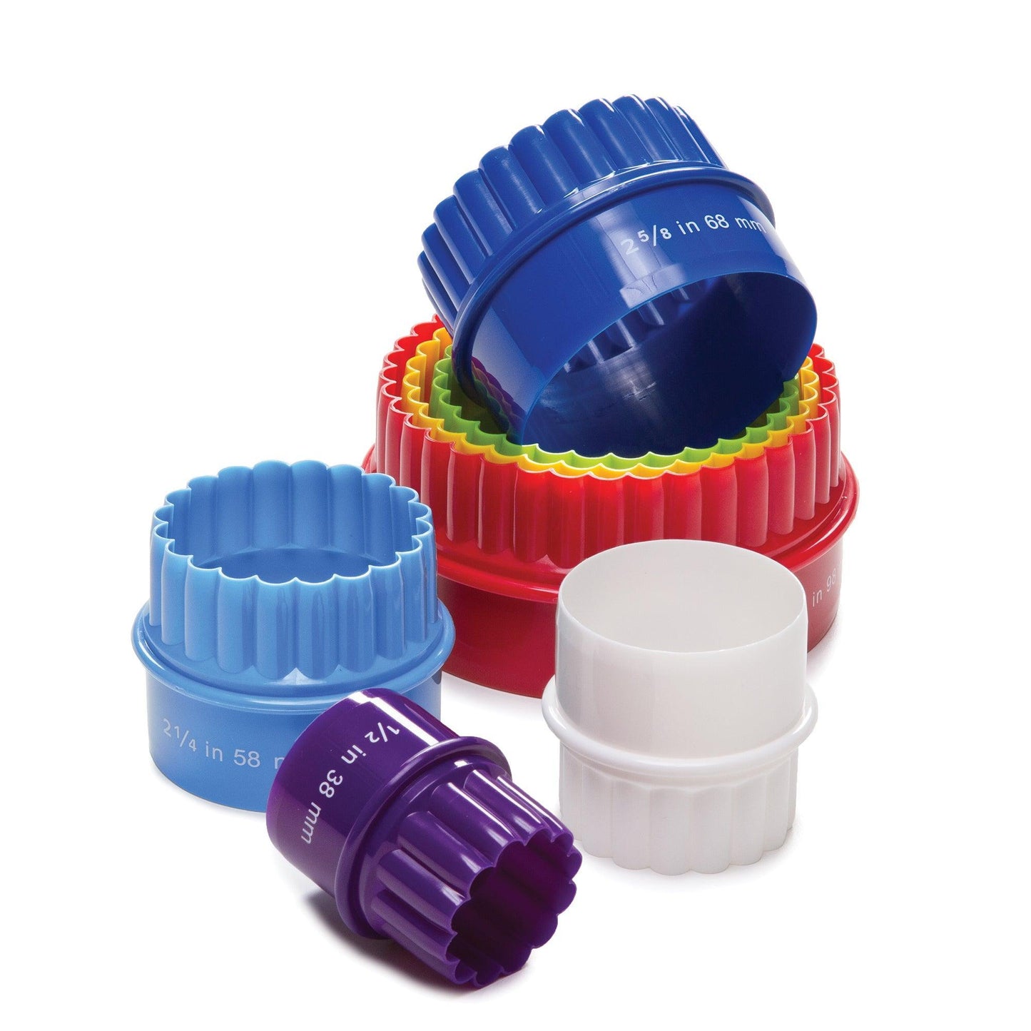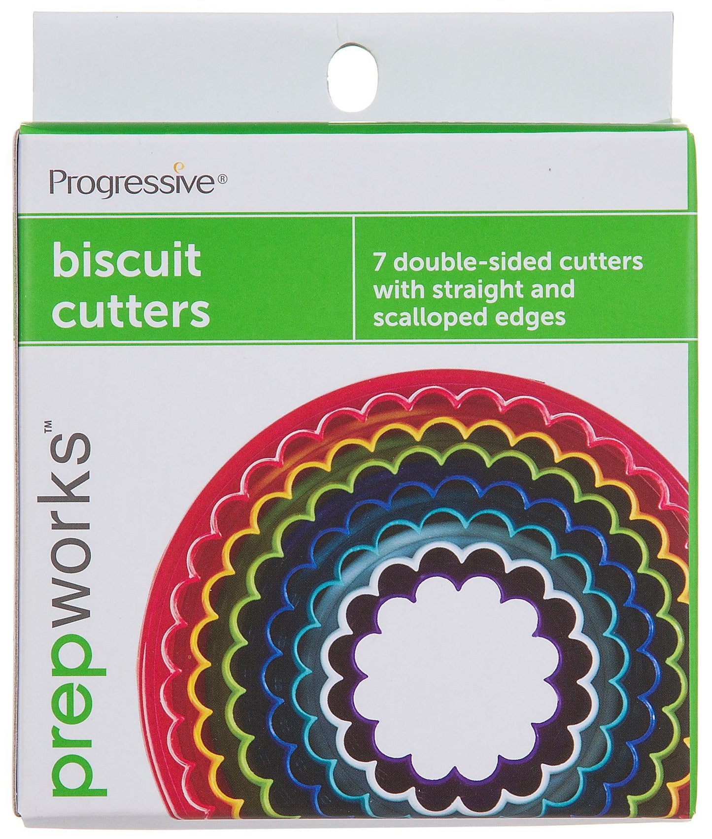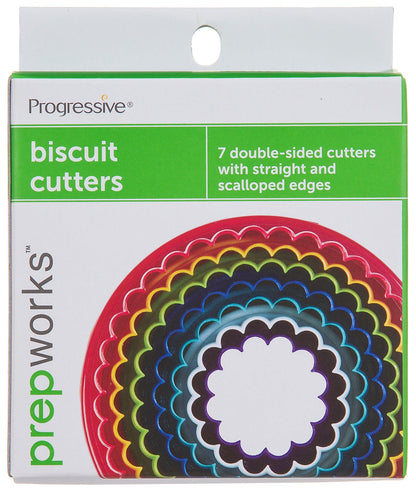 Cut perfect biscuits in any size! This set of seven Biscuit Cutters is double sided for straight or scalloped edges. Deep sides with thin edges make this biscuit cutter set excellent for use with biscuit dough, pie dough, sandwiches and cookies