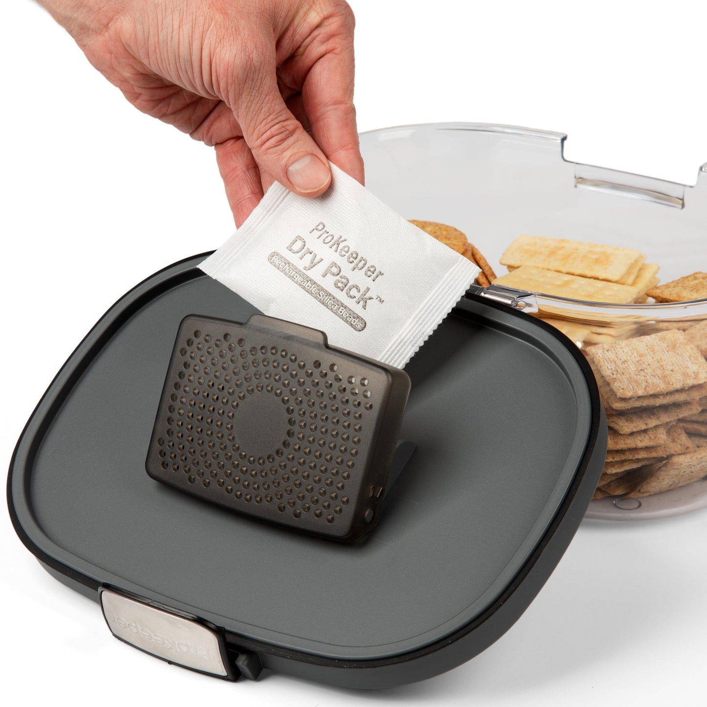Designed with Stay Crisp Technology, the Medium Cracker ProKeeper+ keeps your snacks fresh and crispy for longer. The Prokeeper Dry Pack is rechargeable and helps maintain low humidity for the ideal storage environment. The 3 Qt (2.8 L) size is stackable for space-saving storage and dishwasher safe for easy cleanup.