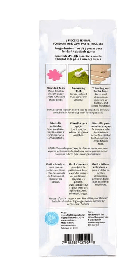 Working with fondant is easier with this 3 piece essential fondant tool set. Cut, Trim and shape fondant with these 3 double ended tools. Rounded Tool: Make dimples, smooth out or create ruffles and shape petals. Embossing Tool: Create textured lines, either thin or wide. Trimming and Scribe Tool: Carve small decorations, puncture air bubbles and creating fine details. BONUS: Scribe Tool can also be used to spread and eliminate air bubbles in Royal Icing when flooding cookies.