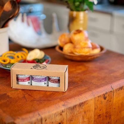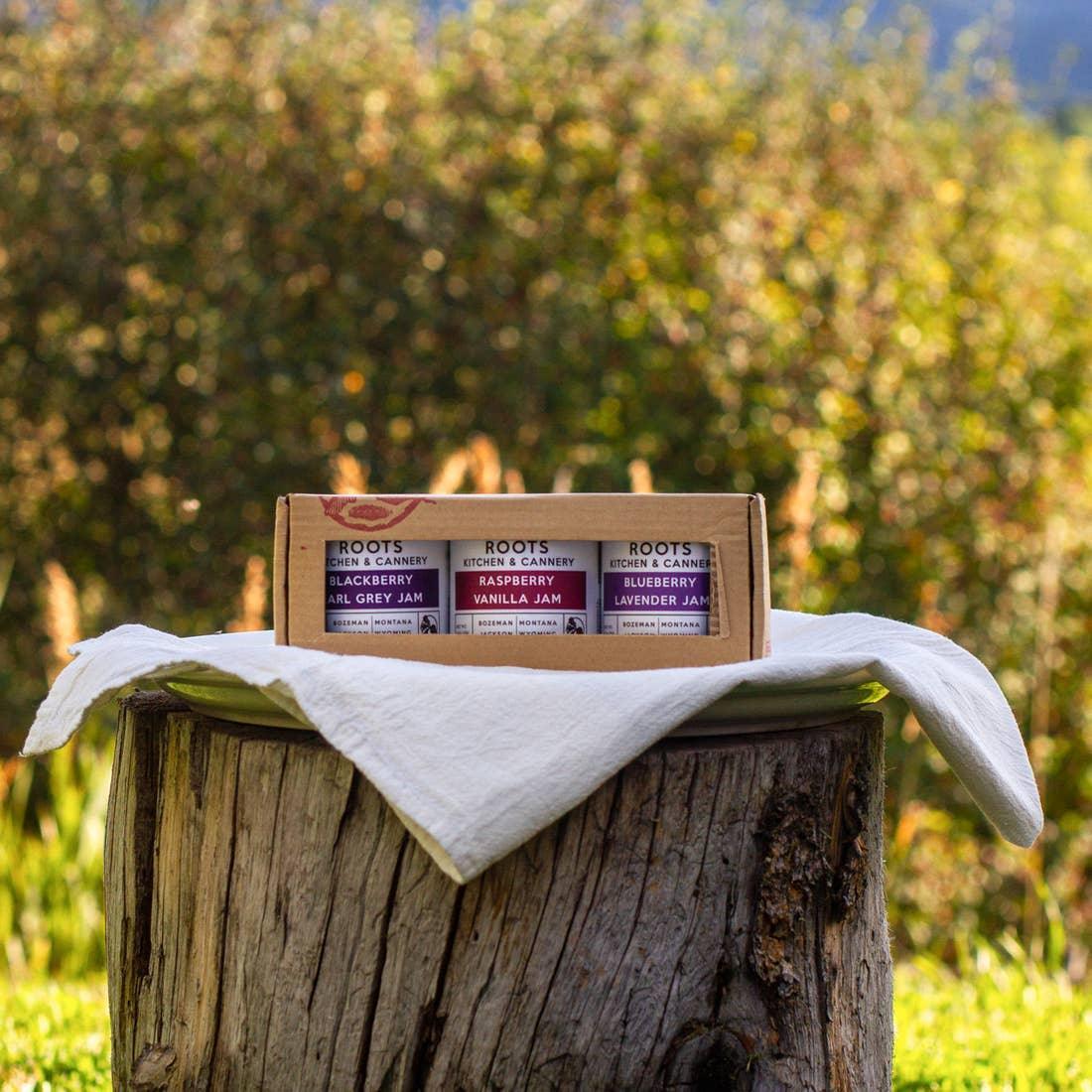 A delicious taste of Roots Kitchen & Cannery three best selling jams: Raspberry Vanilla, Blackberry Earl Gray, & Blueberry Lavender. These little 4.5 oz jars are cute and are amazing stocking stuffers/holiday gifts.