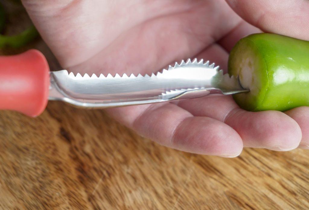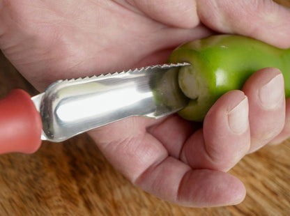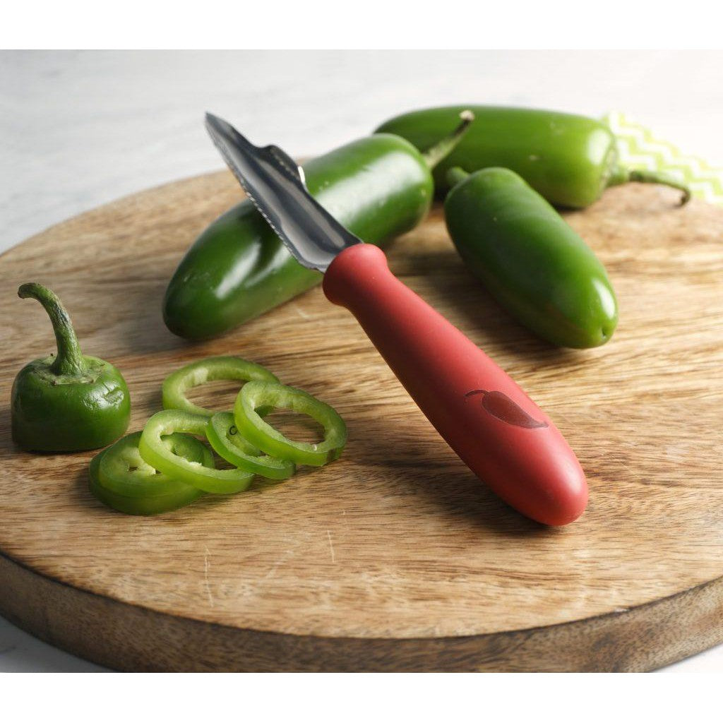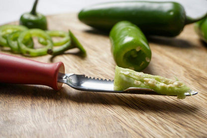 Prepare whole jalapeño and other small peppers for your favorite recipes with this fantastic tool. The rubber handle ensures comfort while the strong stainless steel blade zips through peppers with ease. 8-1/4″ overall length. Dishwasher safe.