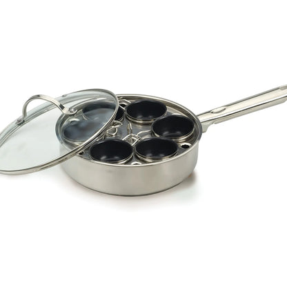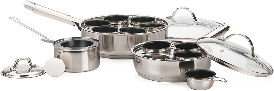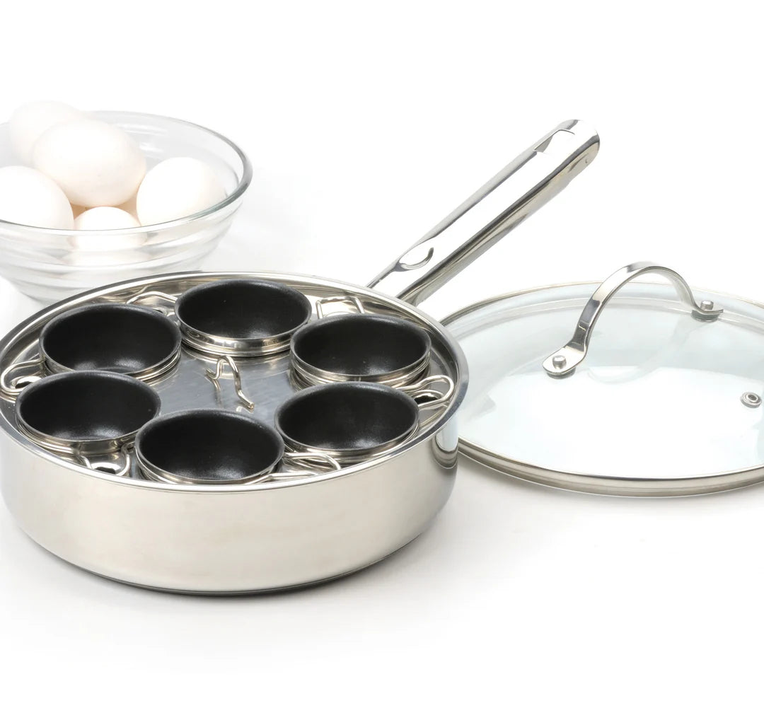- A nonstick poaching insert that cooks one egg at a time, along with a stainless steel pan with a long comfortable handle, and lid.