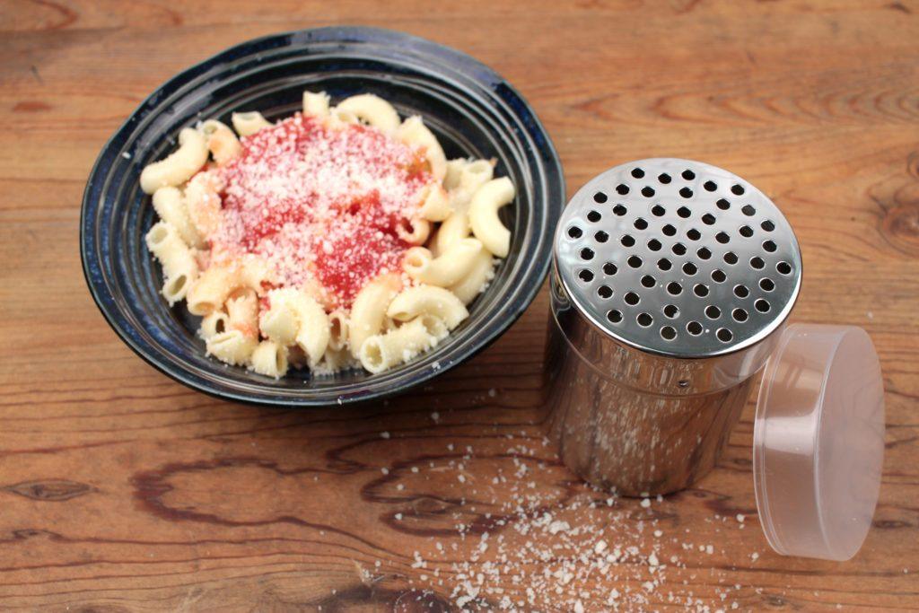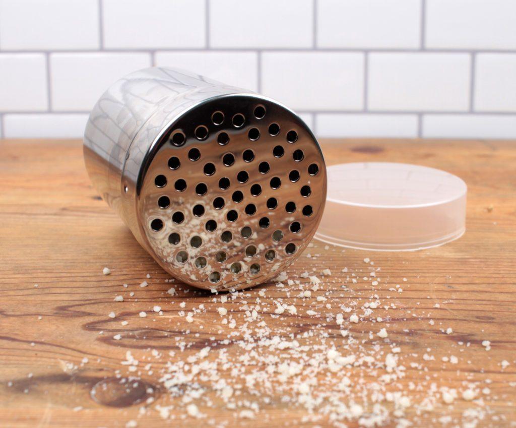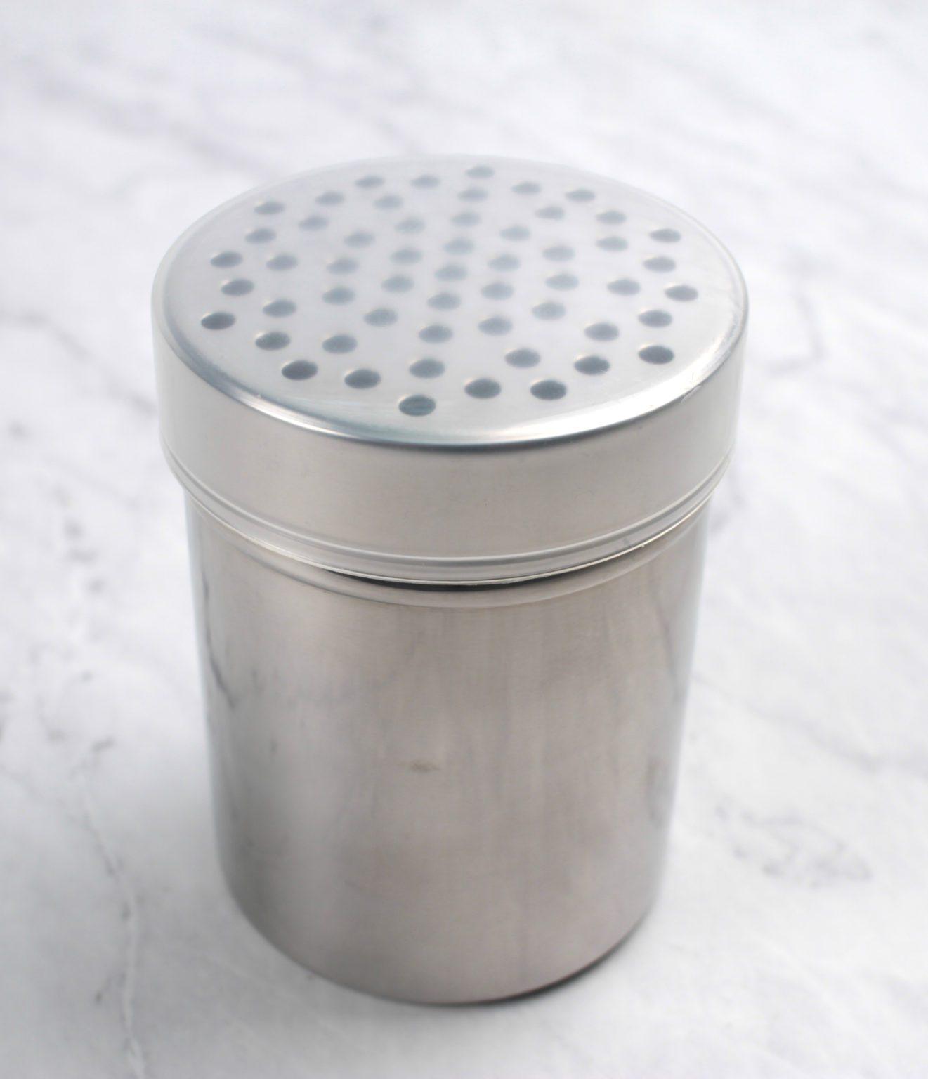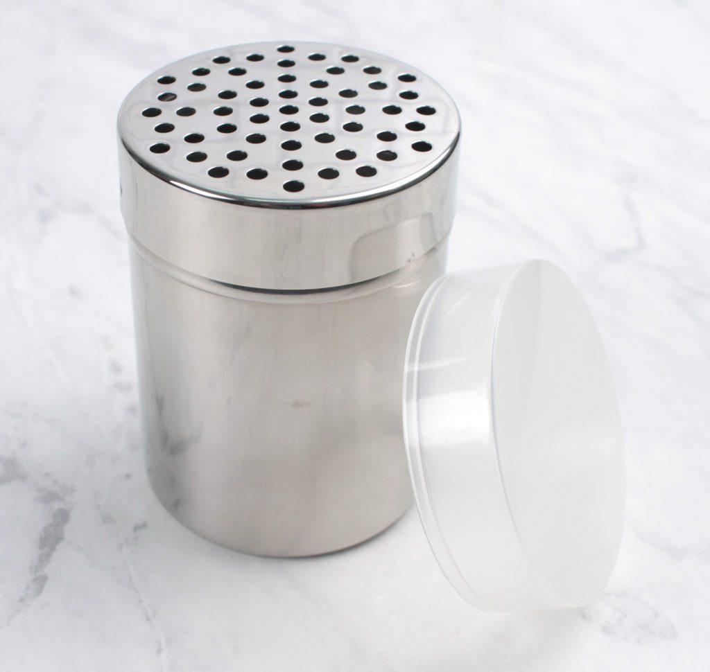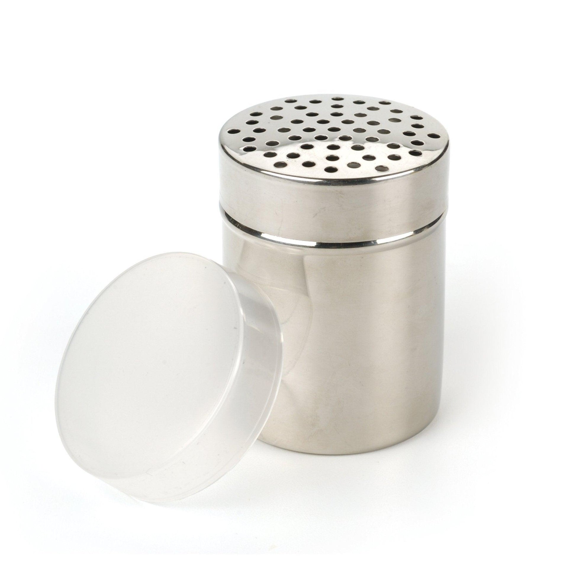 Great for sprinkling grated cheese, coarse herbs, spices or salts . Made from dishwasher safe polished 18/8 stainless steel with an airtight plastic cover. 11 oz. capacity.