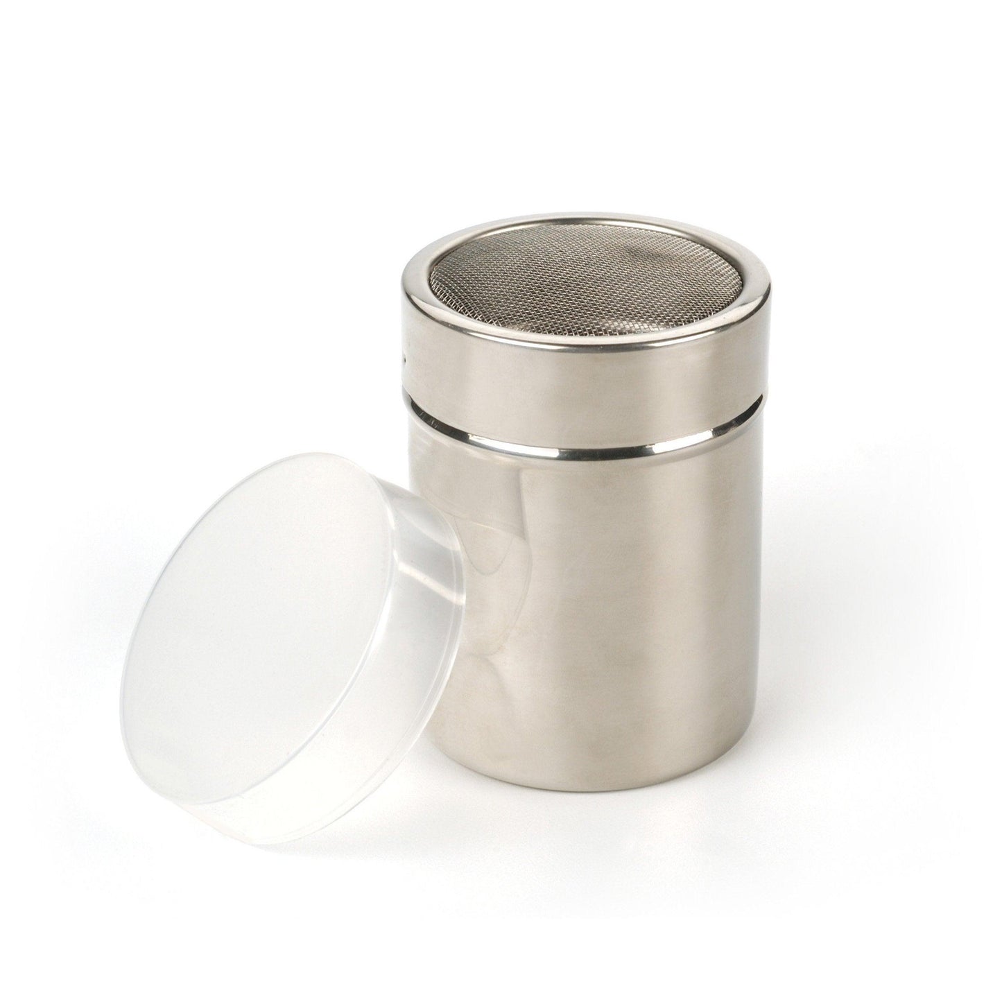 Great for adding powdered sugar, spices or cocoa to lattes, cappuccinos, hot chocolate or pastries. Made from dishwasher safe polished 18/8 stainless steel with an airtight plastic cover. 11 oz. capacity.