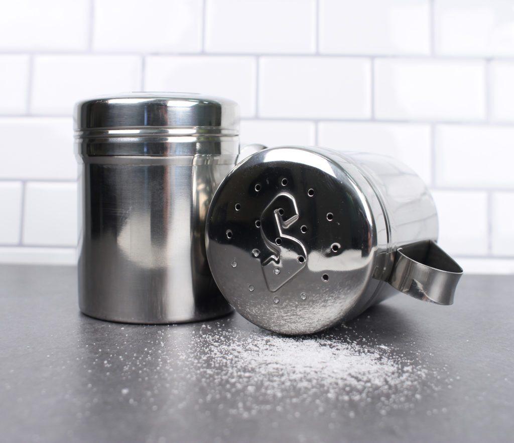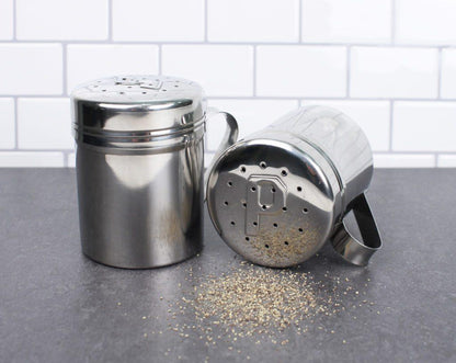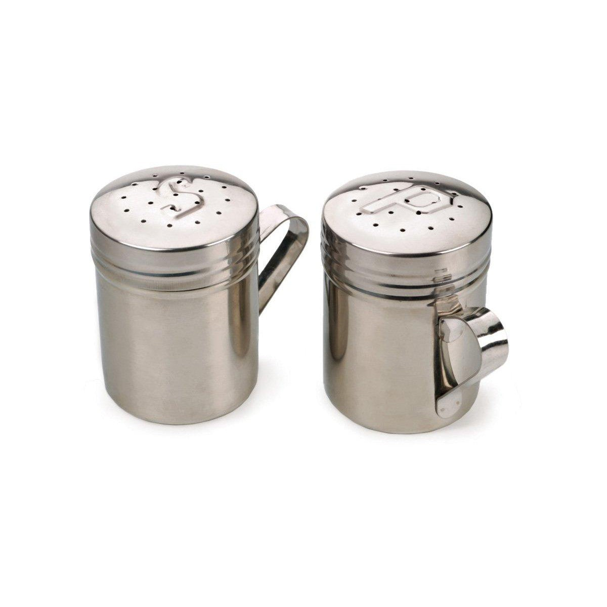 These 18/8 stainless steel salt and pepper shakers are terrific to keep near the stove for quick seasoning. They have large handles, screw on lids for easy filling and hold 10 ounces. Dishwasher safe.