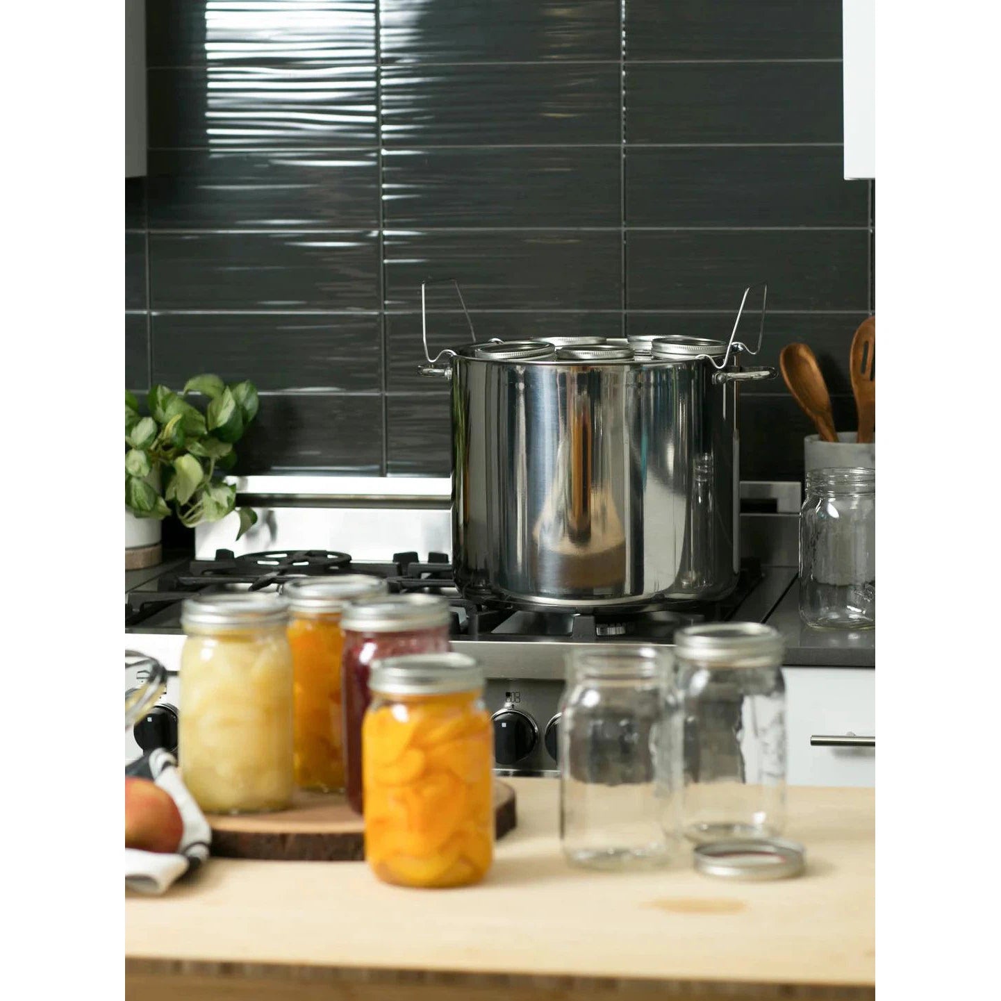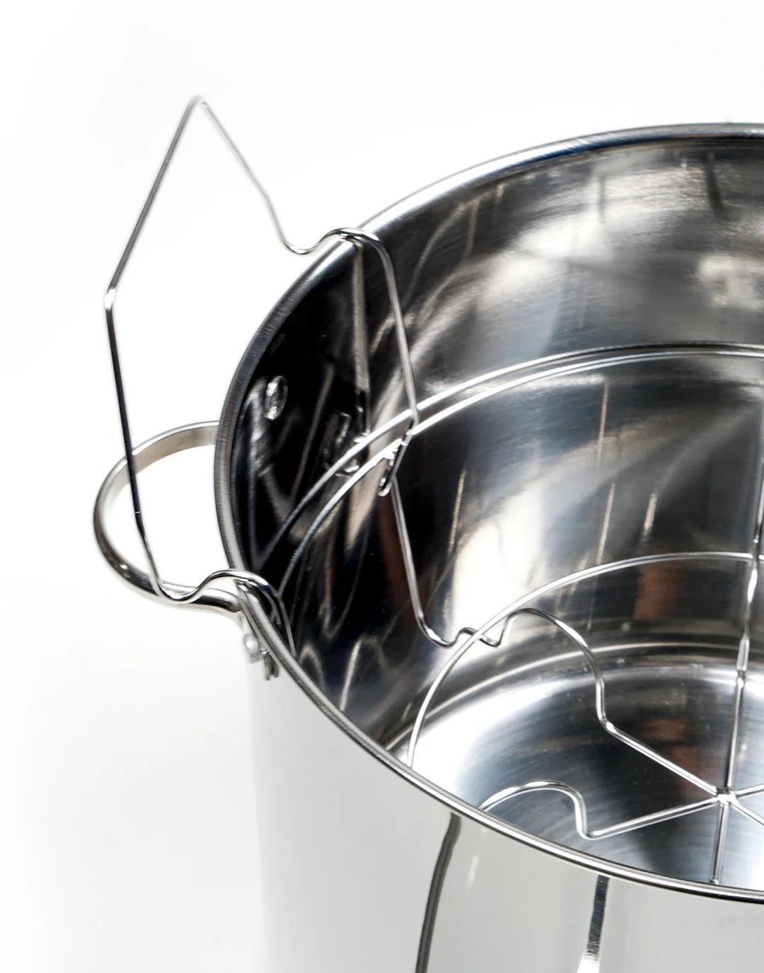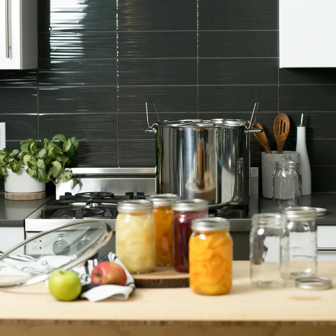 - 20-quart stainless steel water bath canner features a tri-ply base for even heating.