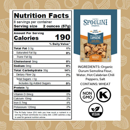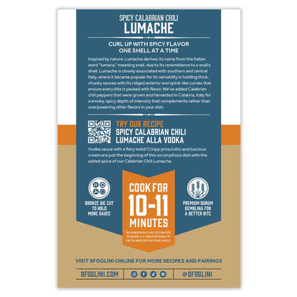 Inspired by nature, Lumache derives its name from the Italian word “lumaca,” meaning snail, due to its resemblance to a snail’s shell. Lumache is closely associated with southern and central Italy, where it became popular for its versatility in holding thick, chunky sauces with its ridged exterior and spiral-like curves that ensure every bite is packed with flavor. We’ve added Calabrian chili peppers that were grown and harvested in Calabria, Italy for a smoky, spicy depth of intensity that complements rather than overpowering other flavors in your dish.