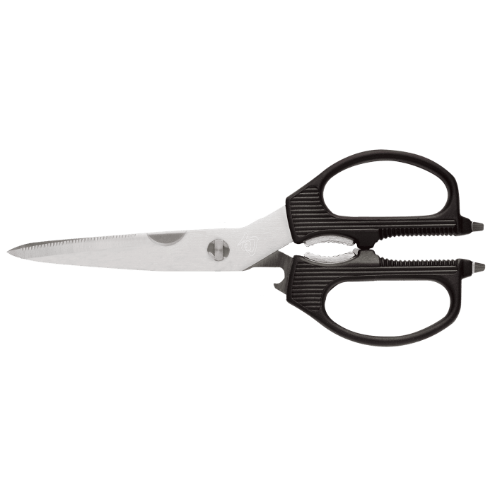 You will be amazed at the many uses for these multi-purpose shears—from opening packages to trimming flowers. There's a built-in nutcracker, a jar opener, a bone notch, a lid lifter, and even two screwdriver tips, one in each handle. They're great for tightening a loose screw in the kitchen cabinet without having to go to the garage to find a screwdriver. Shun Multi-purpose Shears have one blade serrated so they can easily cut through even tough or fibrous materials. The blades separate for easy cleaning, then lock together easily and securely for use.