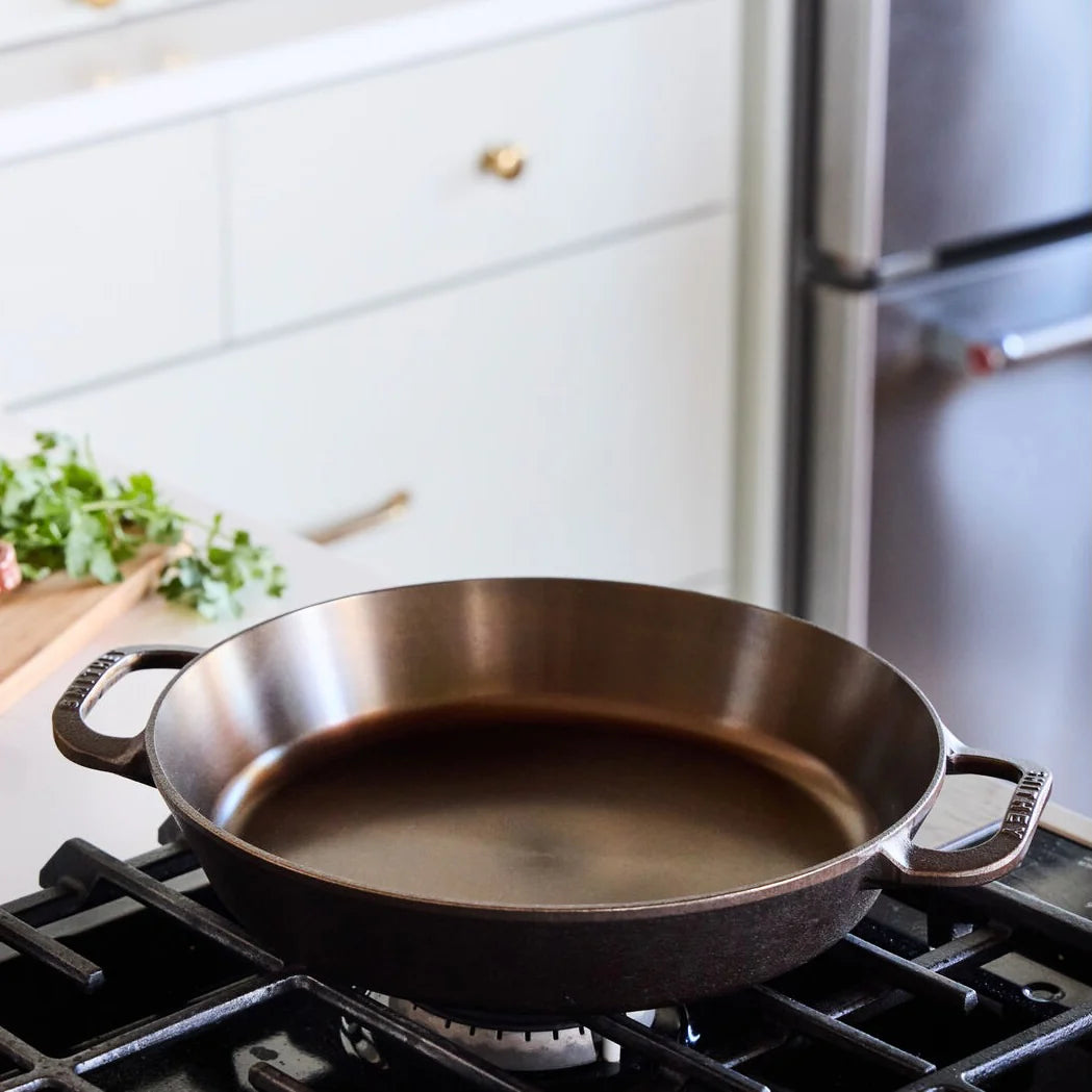 Smithey designed the No. 12 Dual Handle Skillet as a variation of their best-selling No. 12 Traditional Skillet. With two handles crafted for a natural, comfortable grip, this piece makes carrying meals from stovetop to table simple and secure. They've also opened the wall angle of the pan slightly to provide additional capacity and better access to the cooking surface. Carefully crafted with Smithey’s pledge to exceptional quality, this skillet is perfect for meals that move from range to oven to table.