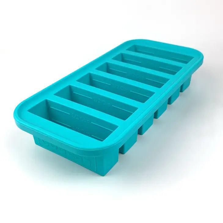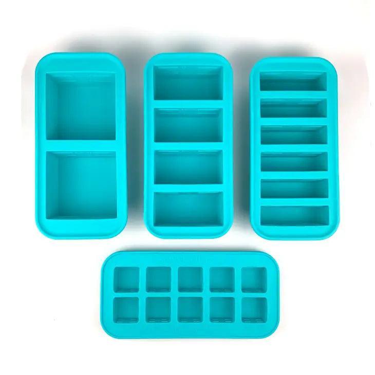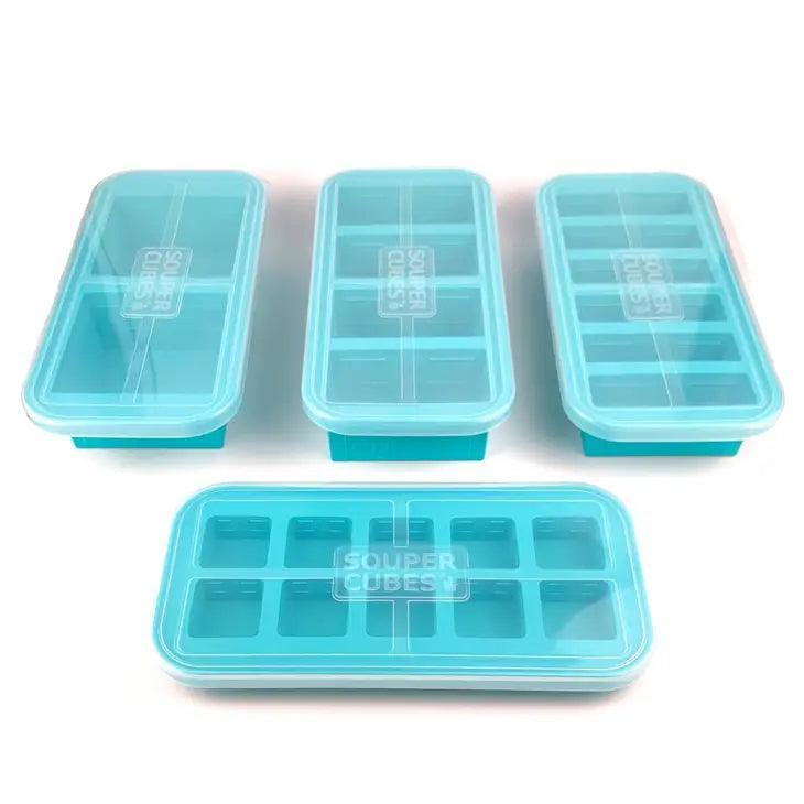 This set of four trays includes one of each of the Souper Cubes® sizes in the signature aqua color with a lid. All lids are interchangeable.