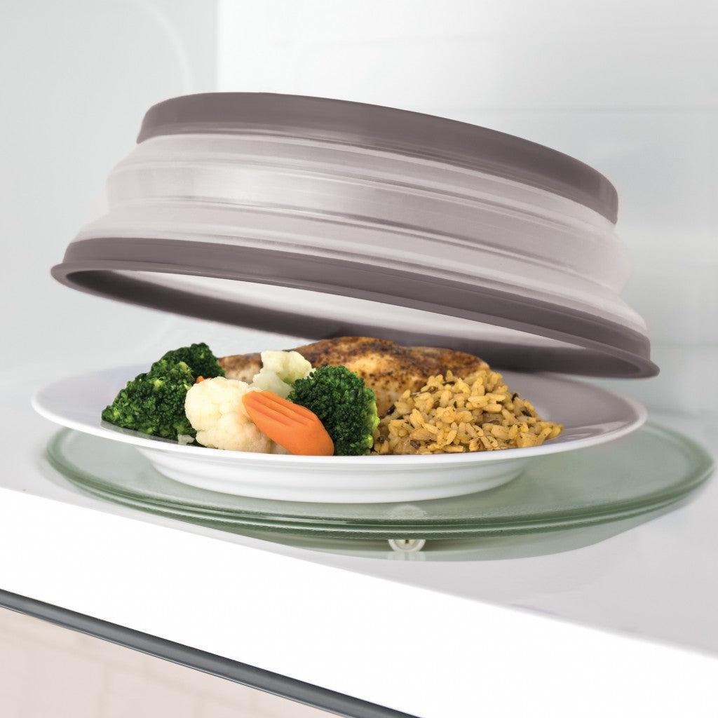 Our Collapsible Microwave Food Cover helps keep food moist and keeps the inside of your microwave clean by preventing splatter. The vented holes allow steam to release evenly, preventing condensation. Designed to fit standard-size plates, yet stores easily, because it is collapsible. An absolutely essential kitchen tool.