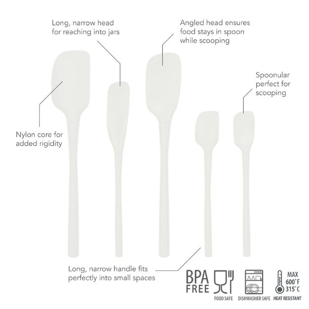 - Dimensions: Spatula 13.5" L x 0.75" W x 2.5" H; Spoonula; 13.5" H x 0.75" W x 2.25" H; Jar Scraper 11.5" L x 0.63" W x 1.38" H; Mini Spatula & Spoonula 11.75" L x 1.5" W x 1" H.