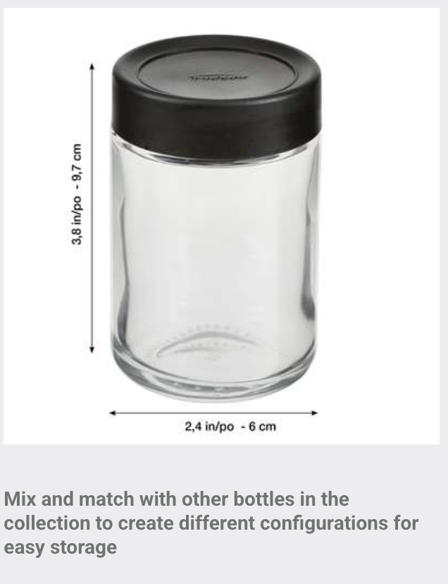 Is your spice collection growing? Trudeau's Single Large Jar is sold separately so you can add as many as you need to your current collection. The jar is completely compatible and can be stacked on top of another small or large bottle. A dual shaker insert is included for either a sprinkle or scoop of spices, such as oregano or basil, whatever your recipe calls for. You can fill up to 6,8 oz / 200 ml of spices per jar, now that's enough to create many delicious home cooked meals.