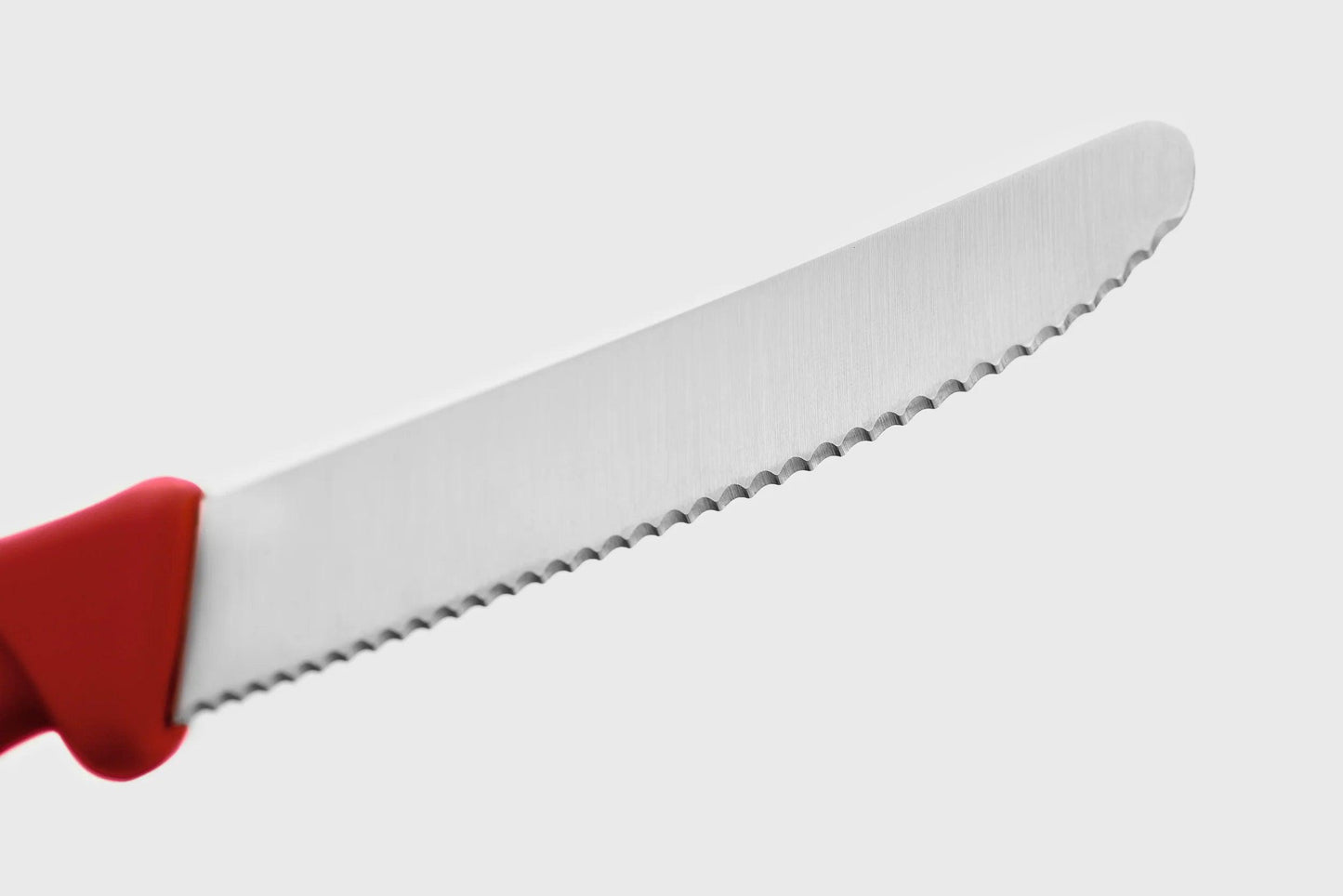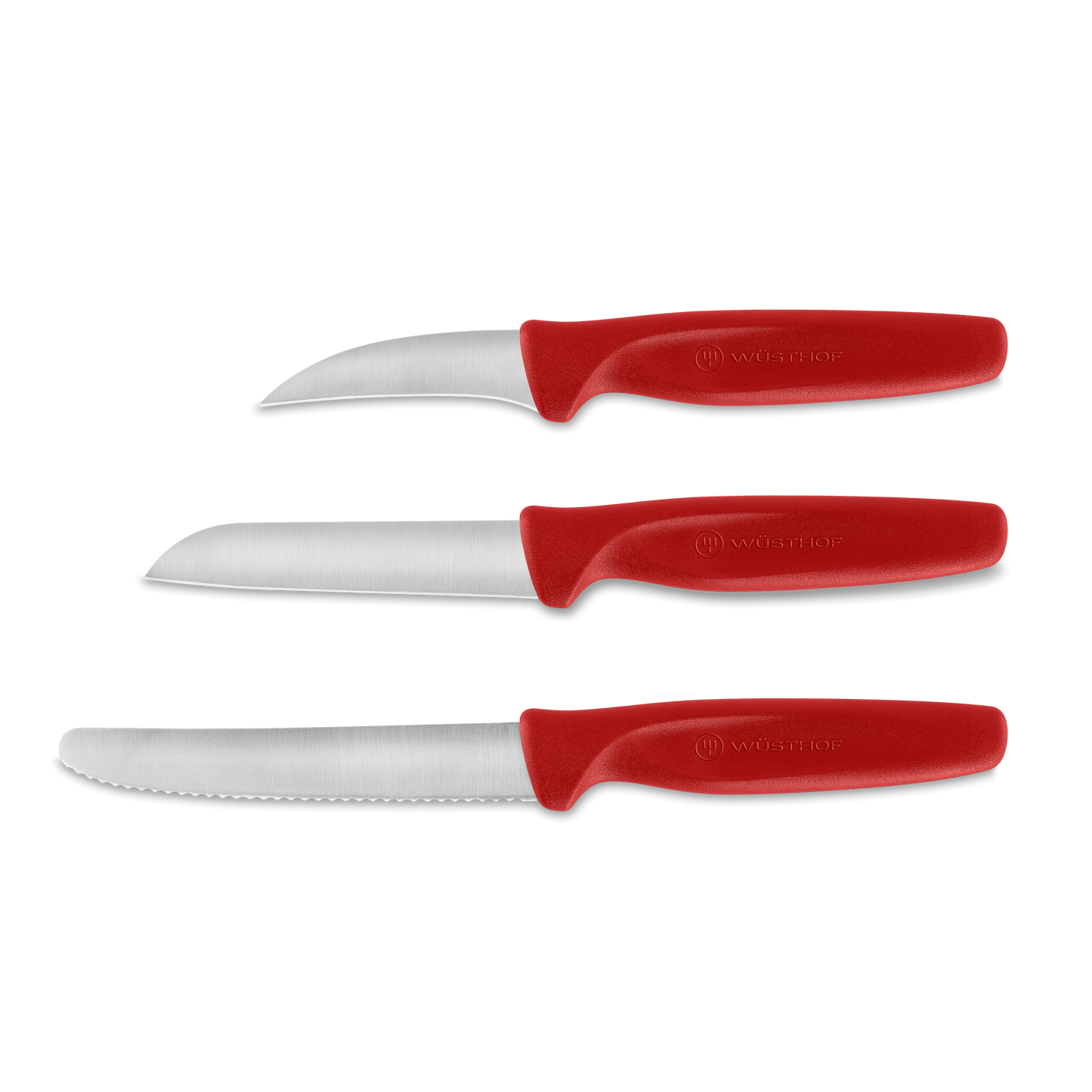 This 3-piece paring knife set includes a 2½-inch peeling knife, 3-inch paring knife, and 4-inch serrated knife.