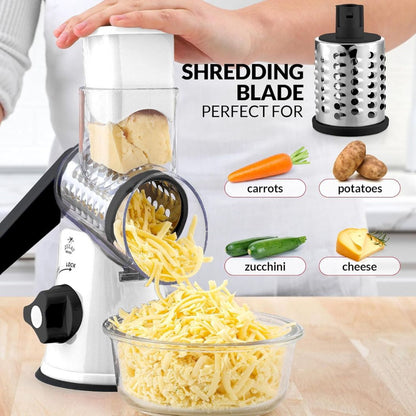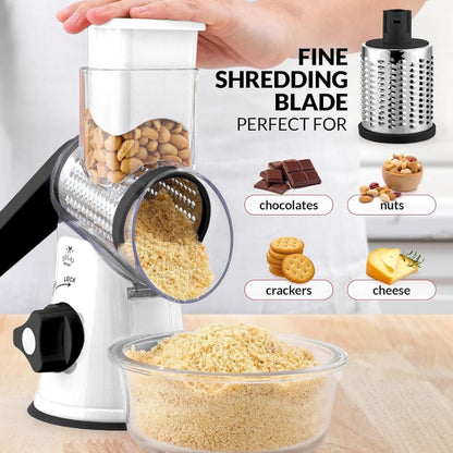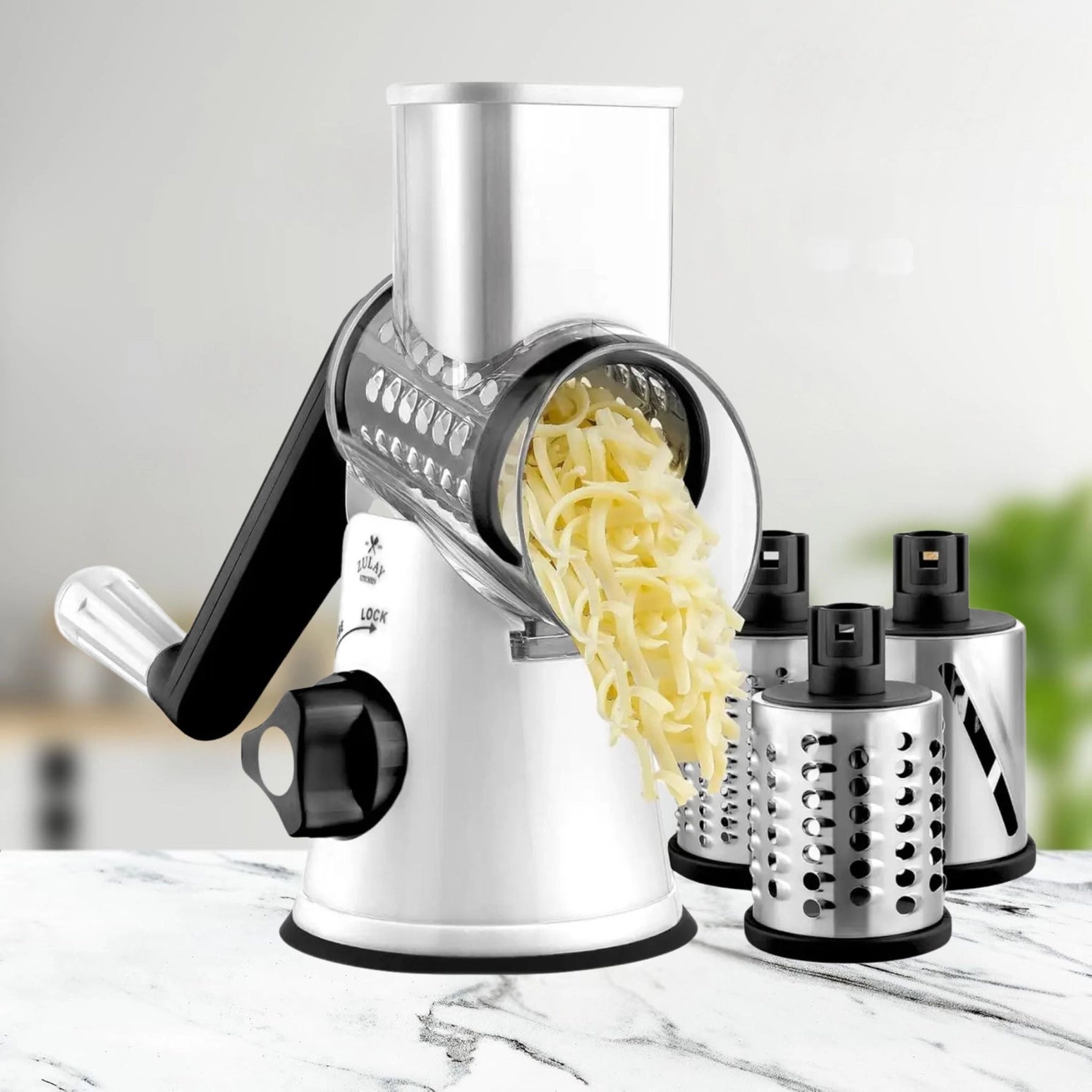 Upgrade your kitchen prep with this Hand-Crank Rotary Cheese Grater, designed for efficiency, safety, and convenience. Featuring three interchangeable stainless steel drum blades, you can easily switch between fine grating, coarse grating, and vegetable slicing. The non-slip suction base locks the grater securely in place, ensuring a smooth, stable operation.